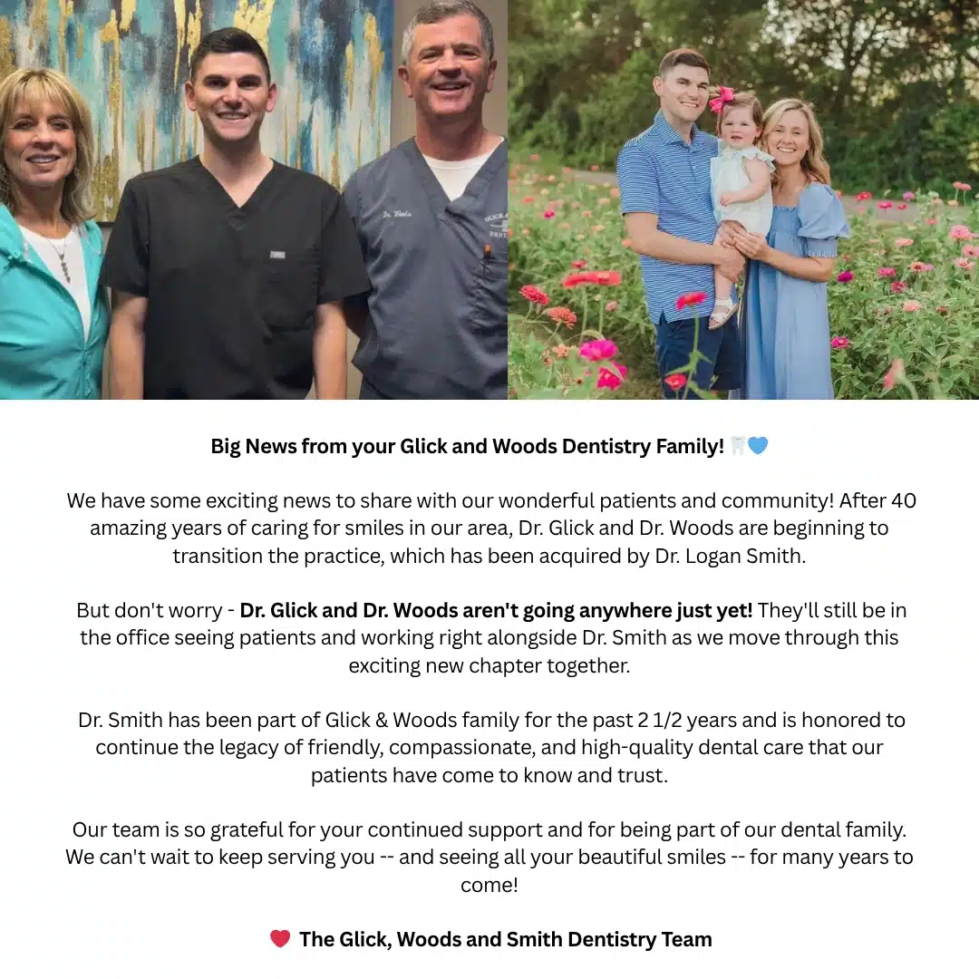 When your family needs state-of-the-art dental care that’s available five days a week and accessible 24/7 for emergencies, you cannot make a better choice than Glick & Woods Dentistry. Since 1985, we’ve served Tullahoma and the nearby communities of Manchester, Shelbyville, ...Winchester and Fayetteville. Dr. Kim Glick has lived in Tullahoma since the ninth grade and has family and friends right here in the community. Dr. Larry Woods has lived in the area for more than 20 years. Along with Dr. Woods, Dr. Glick has created a uniquely comfortable, fun family dentistry experience that patients happily return to over and over for all their family dental health needs. They have over 50 years of dental experience between them, so they can treat virtually any smile problem – thoroughly and with consistently outstanding results. Patients love our compassionate, gentle care. They love being treated nicely and feeling like they are among family and friends in our homey, cozy family atmosphere. They love our comprehensive services because they don’t have to go elsewhere for preventive care, restorative dentistry, cosmetic dentistry, pediatric dentistry and care for periodontal disease. We do it all right here in our dental practice, Monday through Friday, with convenient office hours. And unlike some dental practices where you may see a different dentist each time you visit their dental office, you will always see either Dr. Glick or Dr. Woods when you come here. It’s continuity of care you can count on – and so much more. You and your family deserve affordable dentistry that’s experienced, compassionate, convenient and trustworthy. If you have any questions about our services or treatments or if you're looking for a children's dentist, please call our dental offices at 931.455.3917. For your convenience, you can fill out our online Request an Appointment form to arrange your consultation. We offer our services to residents in and around Coffee County, Franklin County, Bedford County and Lincoln County.